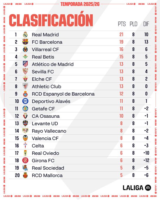 تعرف على ترتيب جدول الدوري الإسباني بعد نهاية الجولة الثامنة من الموسم الحالي 2025/2026، والتي انتهت مساء الأحد.