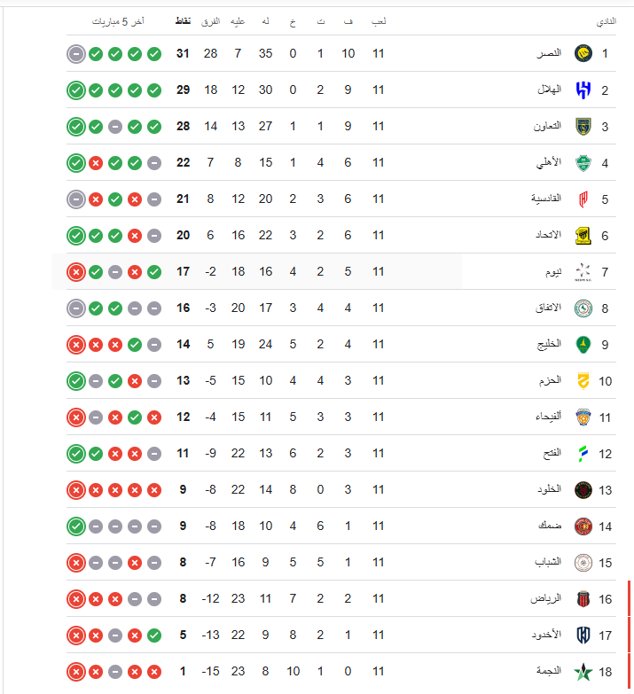 أسفرت منافسات الجولة الحادية عشرة من الدوري السعودي، عن استمرار النصر في صدارة جدول الترتيب، برصيد 31 نقطة، رغم تعادله في هذه الجولة.