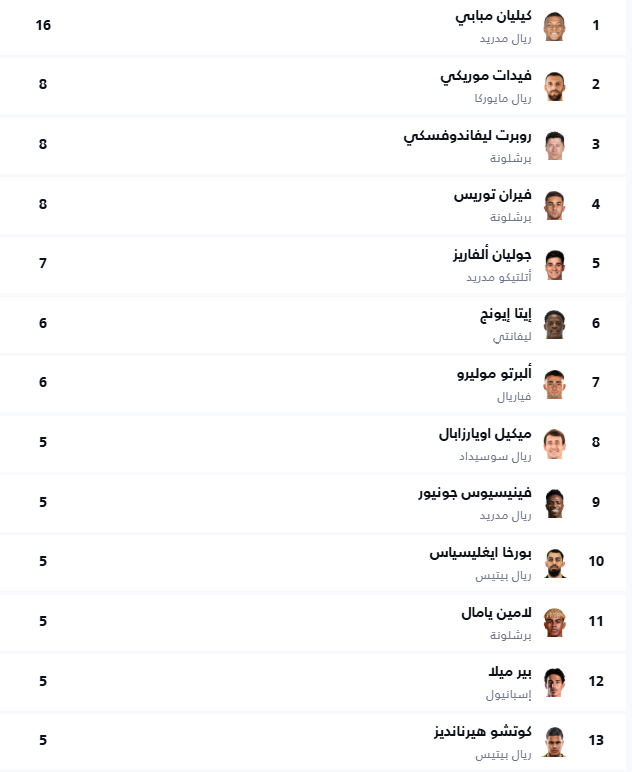 ورفع مبابي رصيده إلى 16 هدف في صدارة الهدافين، ويأتي في المركز الثاني روبرت ليفاندوفسكي نجم برشلونة وموريكي نجم مايوركا، وفيران توريس نجم برشلونة برصيد 8 أهداف لكل منهم.